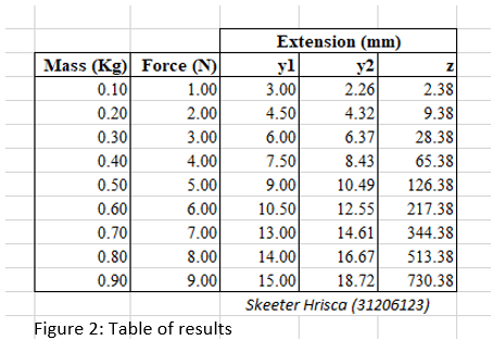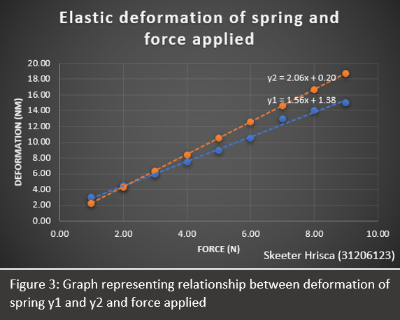 In the first graph (Figure 3), showing the elastic deformation of the two springs, there is a linear progression. It is evident that there is a positive correlation between the force applied and the deformation of the spring. However, for line (y1), it is not a perfect linear correlation since one of the results (y1 = 13.00 mm) resonates outside the expected value for a perfect linear line. This slight error could have been caused by a random error; for instance there could have been a misreading when observing the length extended.