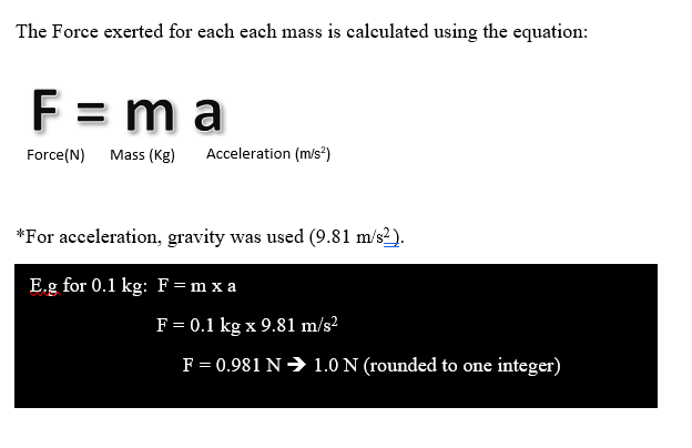 Experimenting Hooke’s Law by observing the relationship between force applied and stretch of a material. In addition to this, monitoring the change in behaviour when an item has gone beyond its elastic limit*. The experiment will use mass to stretch the elastic. The force used can then applied by using the formula: F (force)= m (mass) x a (acceleration).